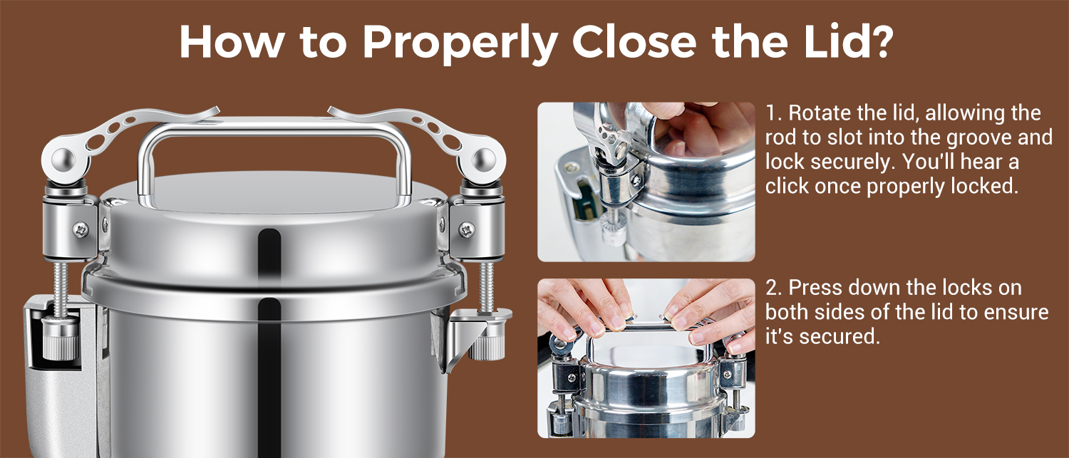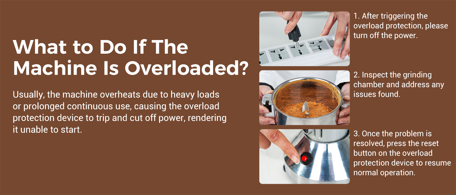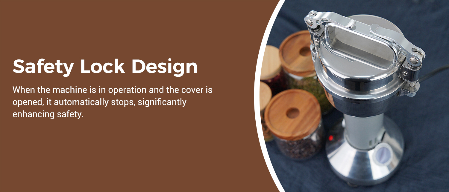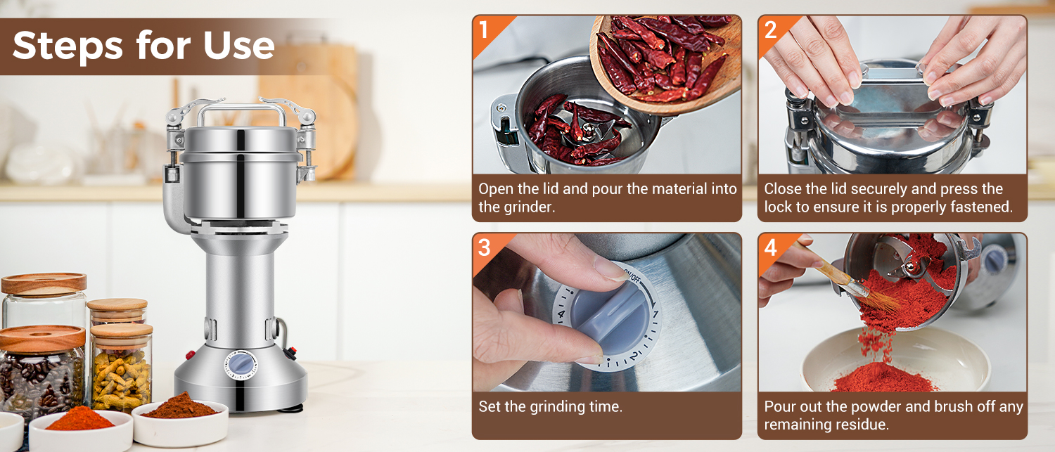 3. Upgraded Double Safety Designs: Equipped with double safety features, this wheat berry grinder stops automatically when the lid is opened, enhancing user safety. Additionally, the overload protector kicks in when the grinder is overloaded, controlling the operation. Operating the powder grinder is simple with a 0-5 minute timer.
